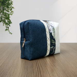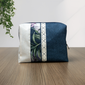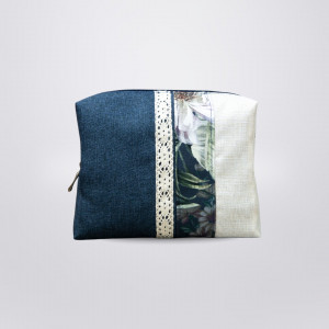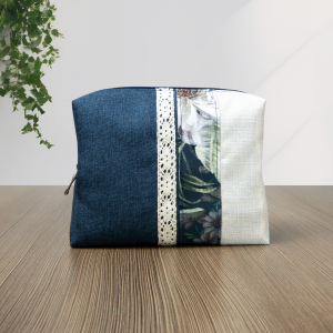 Ta kosmetyczka została uszyta z granatowej płóciennej tkaniny, z tkaniny z roślinnym wzorem oraz tkaniny w kolorze ecru. Jest zamykana na zamek, a dzięki swojej konstrukcji umożliwia szerokie otwarcie i wygodny dostęp do zawartości.