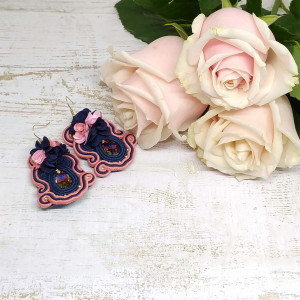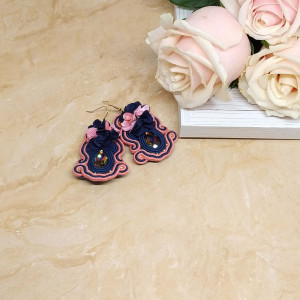 kryształki S w kolorze volcano, sutasz polski w kolorze granatowym i brzoskwiniowym, kwiatki z materiału granatowo różowe, perełki S w kolorze vintage light gold,