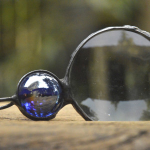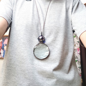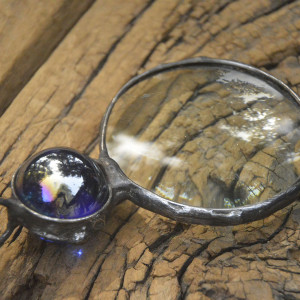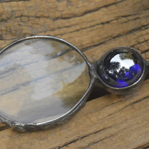 Autorska lupa o średnicy 5 cm ozdabiana szklaną granatową kula srednicy 22 mm oprawiona w miedź lutowaną stopem cyny i srebra. Długość lupy to ok. 9 cm. Całość patynowana na kolor starego srebra ręcznie przecierana i polerowana , zawieszona na 60 cm łańcuszku. Jeśli życzą sobie Państwo inną dowolną długość łańcuszka proszę o informacje mailową po zakupie a bez problemu to zmienię. Zapraszam do zakupu ...