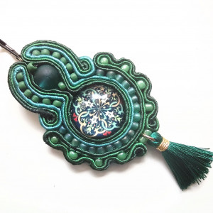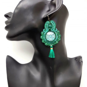 Kolczyki wykonane w technice haftu sutaszowego. Szyje się kolorowe sznureczki ze sobą, wszywając między nie - milimetr po milimetrze - minerały, szkło, koraliki ceramiczne itp.