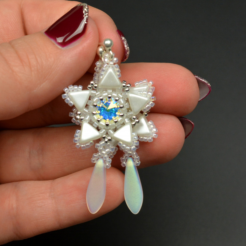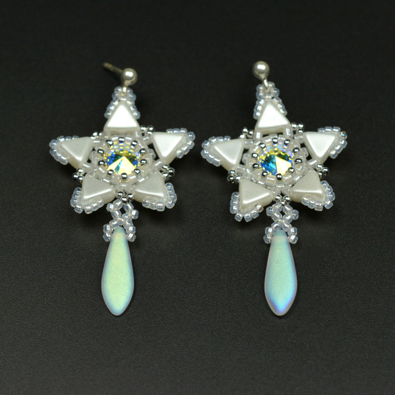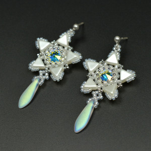 Ich serce stanowią kryształy Swarovskiego w kolorze crystal AB, które oplotłam najwyższej jakości japońskimi koralikami Miyuki, Toho i francuskimi Kheops par Puca, wszystko to w kolorze perłowej bieli złamanej jasnym srebrem. Poniżej wyplatanych gwiazd zawiesiłam matowe czeskie groty z efektem opalizacji.