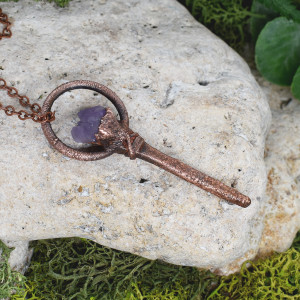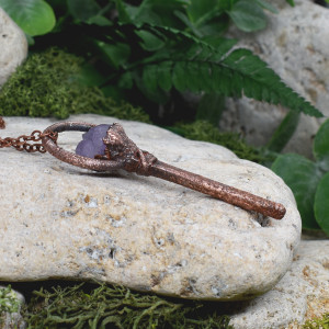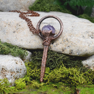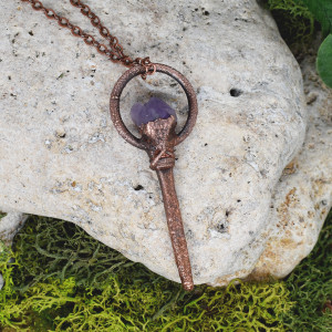 Ręcznie wykonany wisior z surowym ametystem w kształcie gwoździa. Takich gwoździ używano do zabijania trumien czy ozdabiania tarcz lub skrzyni. Oprawa wykonana z miedzi metodą elektroformowania, patynowana.