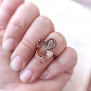 Pierścionek został z pasją wykonany z miedzi oraz prawdziwego kwiatu hortensji techniką elektroformowania miedzi.