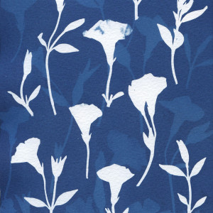 Autorska ilustracja wykonana w technice cyjanotypii- metodzie polegającej na naświetlaniu matrycy pokrytej światłoczułym roztworem. Do wykonania grafik używam mazurskich kwiatów, krzewów i traw.
