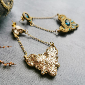 Ta para sutaszowych kolczyków wykonana została z cieniutkich poliestrowych sznurków sutasz z użyciem szklanych fasetowanych kryształków w pięknym morskim kolorze i szklanych koralików. Kolczyki zawieszone są na łańcuszkach ze stali szlachetnej, a całość zamieszczona jest na sztyfcie montowanym z tyłu górnego elementu, również ze stali. Tył wykończony jest połyskującym złotym materiałem brokatowym — kolczyki nie tracą na atrakcyjności nawet od tyłu!