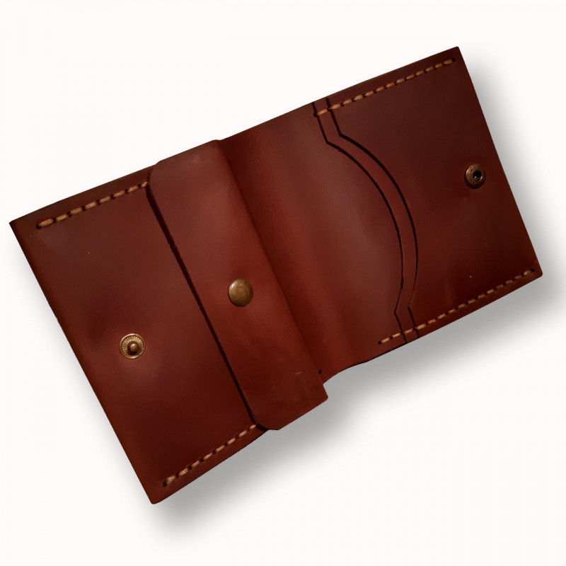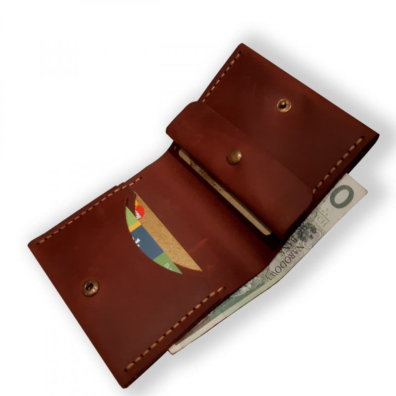 Zamknięty ma kształt kwadratu o boku 10 cm. Dla Ciebie: przegródka na banknoty trzy przedziałki na karty bankowe lub dokumenty kieszonka na monety z bezpiecznym zapięciem.