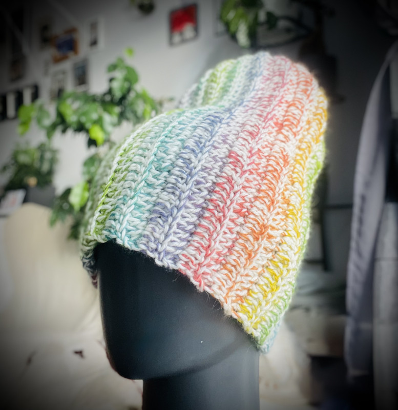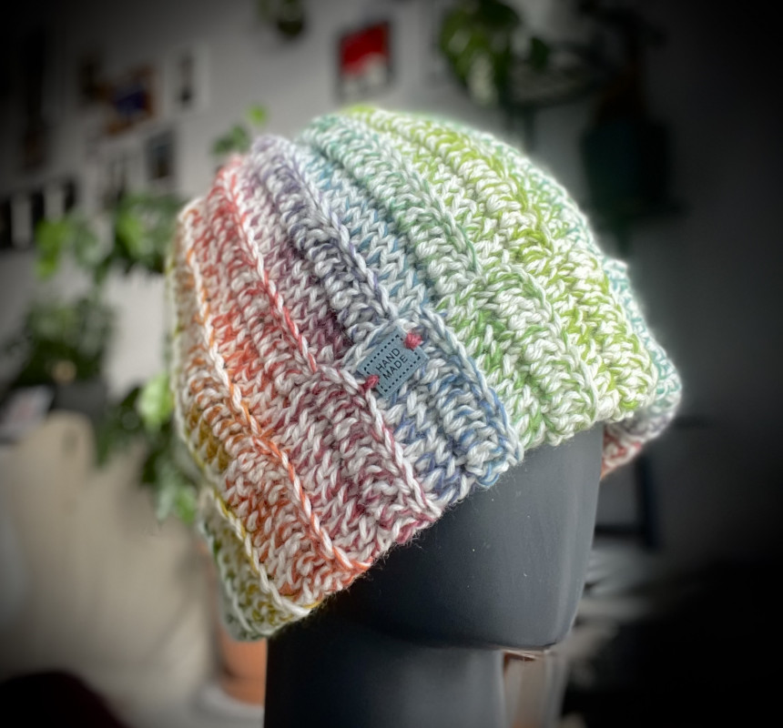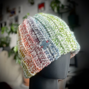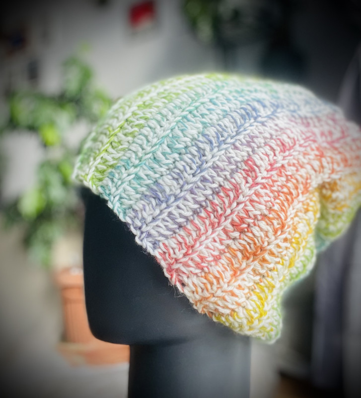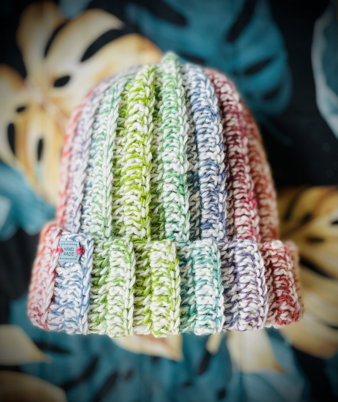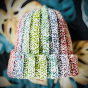 Czapka wykonana ręcznie na szydełku z dwóch włóczek o bogatym składzie.