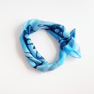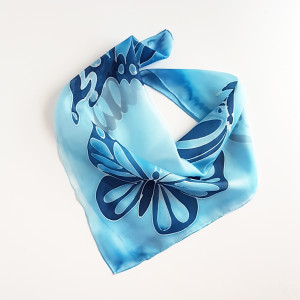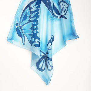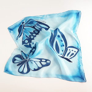 Delikatna, ręcznie malowana, jedwabna apaszka o wzorze motyli w odcieniach granatu na jasno niebieskim tle.Apaszka podpisana przez autorkę. Wymiary apaszki to 55 x 55cm. Zapakowana jest w ręcznie malowaną ekologiczną torebkę z motywem maków. Apaszka będzie namalowana specjalnie dla Ciebie. Do chusty dołączona jest obszerna informacja o jedwabiu, malowaniu na nim i sposobie dbania o niego. Podaruj sobie jedwabną przyjemność! Naturalny jedwab jest doskonały zarówno na jesienne i zimowe chłody, jak i letnie upały. Ta delikatna i fantazyjna tkanina jest w moim odczuciu najlepsza jako materiał dla wytwornych kobiecych strojów i dodatków. Uwaga: Kolory widoczne na ekranie mogą się nieznacznie różnić od rzeczywistych kolorów - przyczyna tkwi w różnej kalibracji monitorów oraz barwie światła w jakiej wykonuję zdjęcia. Każdy mój ręcznie malowany produkt jest unikatowy i będzie się różnił nieznacznie od tego, który jest na zdjęciu o ile nie jest to gotowy produkt do kupienia. Wszystkie wzory maluję ręcznie bez użycia szablonów, więc każdy szal czy chusta jest wyjątkowy.