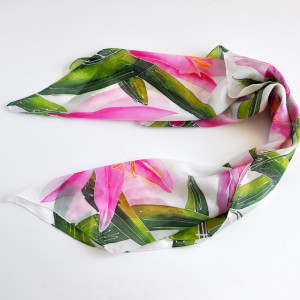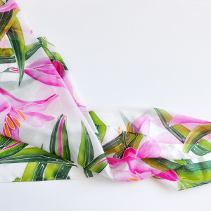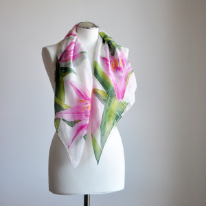 Delikatna, ręcznie malowana, jedwabna chusta o wzorze łąki z liliami. Na chuście rozmalowane są kwiaty lilii w odcieniach różu oraz roślinne wzory na białym tle jedwabiu. Chusta podpisana jest przez autorkę. Wymiary chusty to 90x90cm.