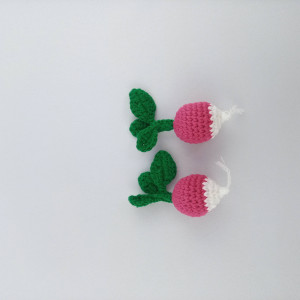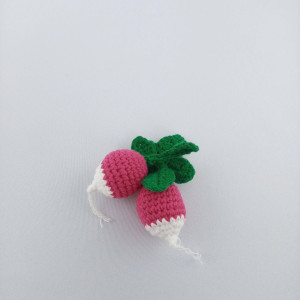 Ręcznie robione rzodkiewki. Idealnie się sprawdzą w zabawach w sklep, piknik czy gotowanie. Zestaw zawiera 2 sztuki. Produkt przeznaczony dla dzieci od 3 roku życia.