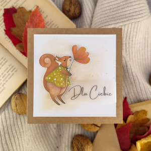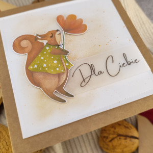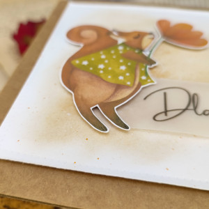 Urocza wiewiórka z kwiatkiem, delikatny akcent w kolorze złotym oraz subtelny napis sprawiają, że kartka staje się wyjątkowa i unikalna.