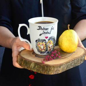 Kubek ręcznie malowany- Dobrze, że jesteś Z motywem zakochanych jeży Będzie idealnym prezentem dla ukochanej osoby by podkreślić jak bardzo jest dla nas ważna i jak bardzo cieszymy się, że jest. Możliwość personalizacji cytatu a także domalowania większej ilości jeży (realizacja całej rodziny) po uzgodnieniu szczegółów w wiadomości prywatnej. Kubek namalowany wysokiej jakości farbami do porcelany, przeznaczonymi do kontaktu z żywnością i odpornymi na ręczne mycie. Maluję wymarzoną porcelanę dla Ciebie i Twoich bliskich by wnieść do życia odrobinę więcej radości :) Zapraszam