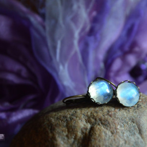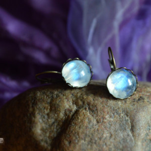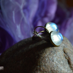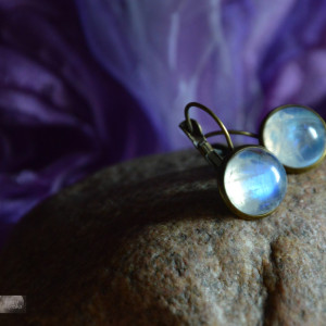 Kolczyki z kolekcji vintage, w stylu carskiej Rosji, wykonane z antycznego złota. Specjalny jubilerski stop miedzi i mosiądzu, nie zawiera kadmu, niklu ani ołowiu. W żaden sposób nie uczula. Kolczyki w koronie ażurowej lub oprawie obręczowej. Przepiękne kaboszony kolczyków 12 mm, to zjawiskowy Kamień Księżycowy Adularowy z Birmy. Kolczyki bardzo lekkie i wdzięczne w noszeniu na biglu angielskim.