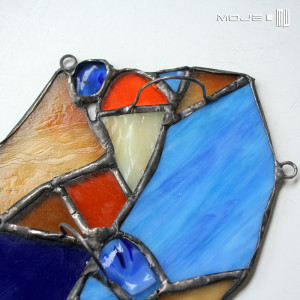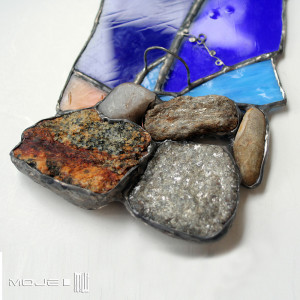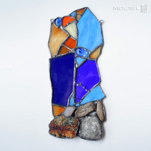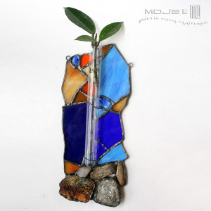 Zrobiłam go z witrażowego szkła w odcieniach błękitu, szafiru, miodu i pomarańczu. Są też prawdziwe kamienie znad górskiej rzeki. Całość oprawiona i wykończona jest miedzią - cynowaną, patynowaną i przecieraną. Wiszący dekor ma uchwyty, w które należy wsunąć podłużny szklany wazonik z pojedynczym żywym kwiatem, zieloną laską bambusa, lub suszonym kwiatem.