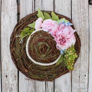 Kapelusz ozdobny ozdobiony winogronem i kwiatami piwonii. Średnica ok 30 cm