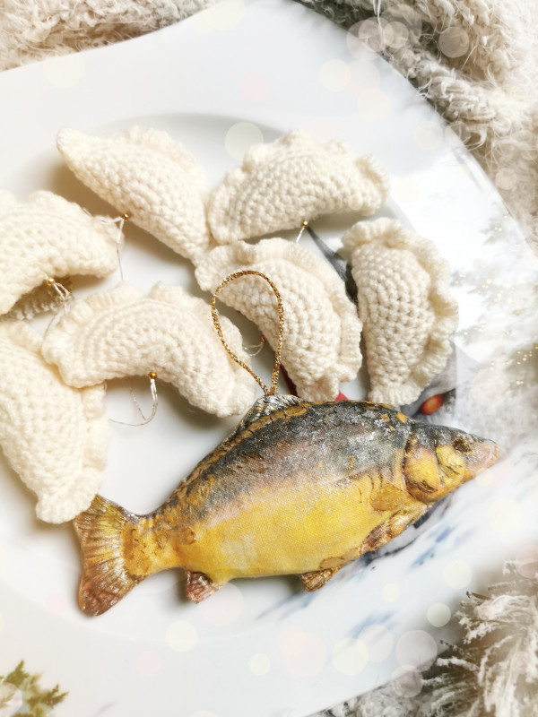 Bonus: Dla tych, którzy kochają świąteczne tradycje z odrobiną humoru, mamy również bombki w kształcie pierogów! Każda z nich ręcznie wyszywana i malowana z taką samą starannością, jak nasze karpie.