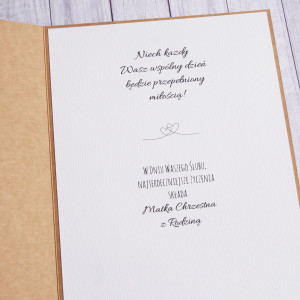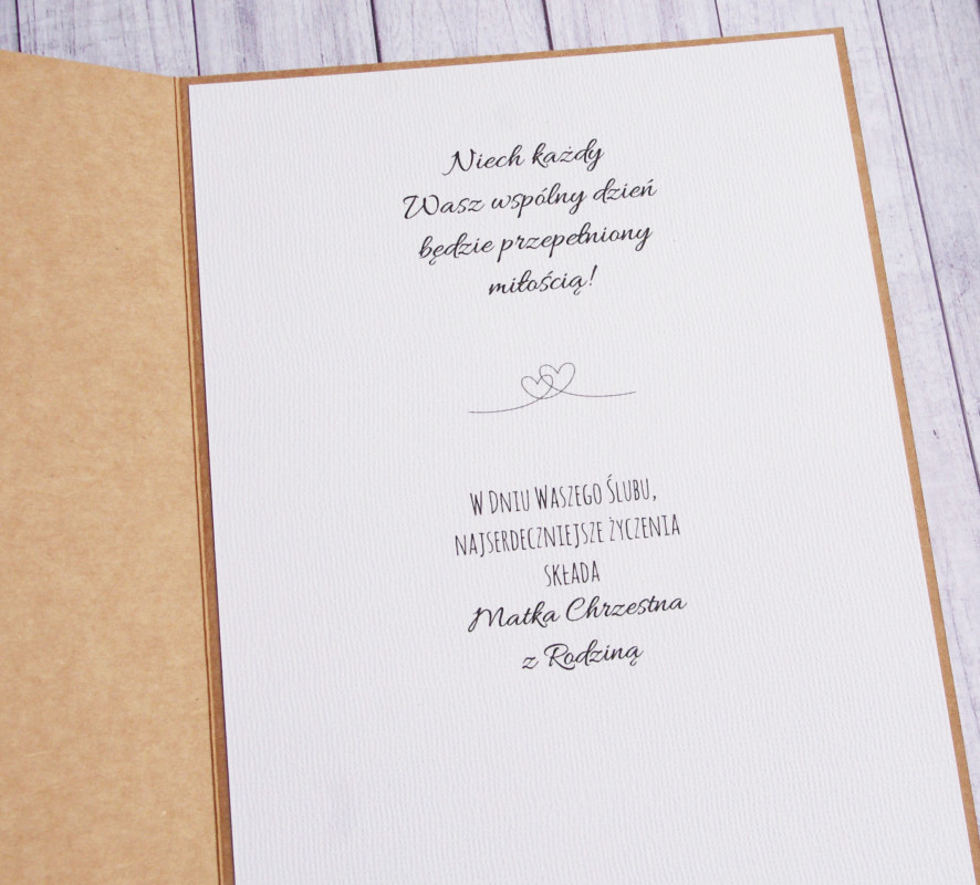 w środku wklejone personalizowane życzenia (takie jak na zdjęciu lub dowolne - wg Twojego pomysłu) - drukowane na tym samym papierze wizytówkowym.