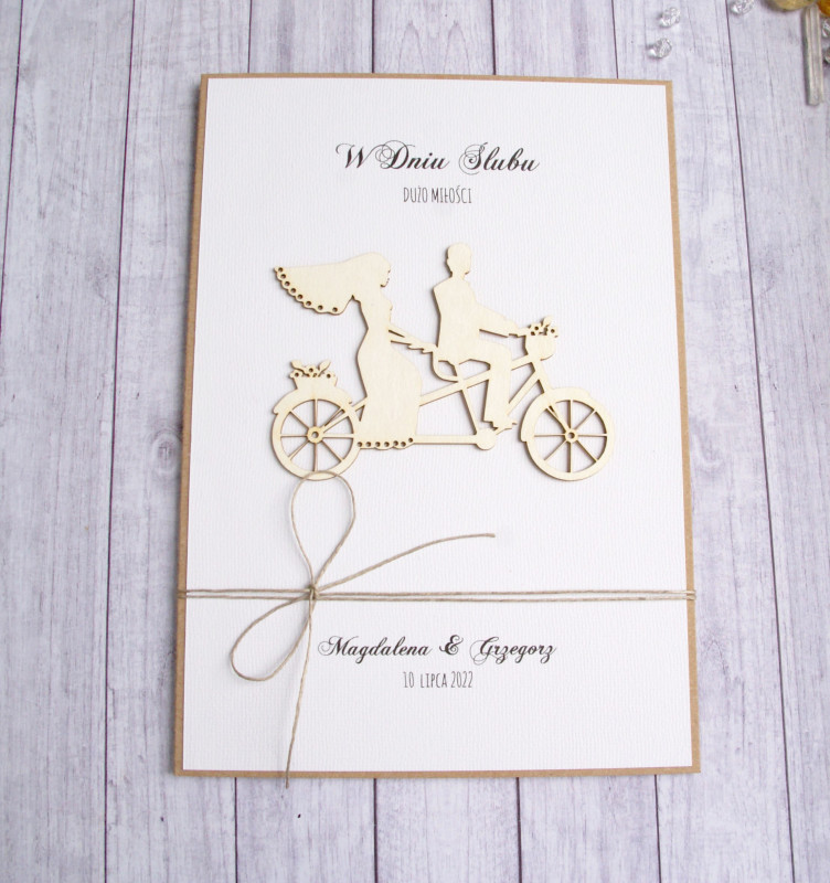 wykonana na bazie grubego kartonu EKO-kraft (100% makulatury), ozdobiona najwyższej jakości papierem wizytówkowym (faktura płótna) z personalizacją. w centrum : najwyższej jakości tekturka z beermaty.tandem z młodą parą.. kartka przewiązana naturalnym sznurkiem.