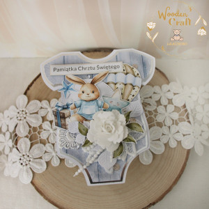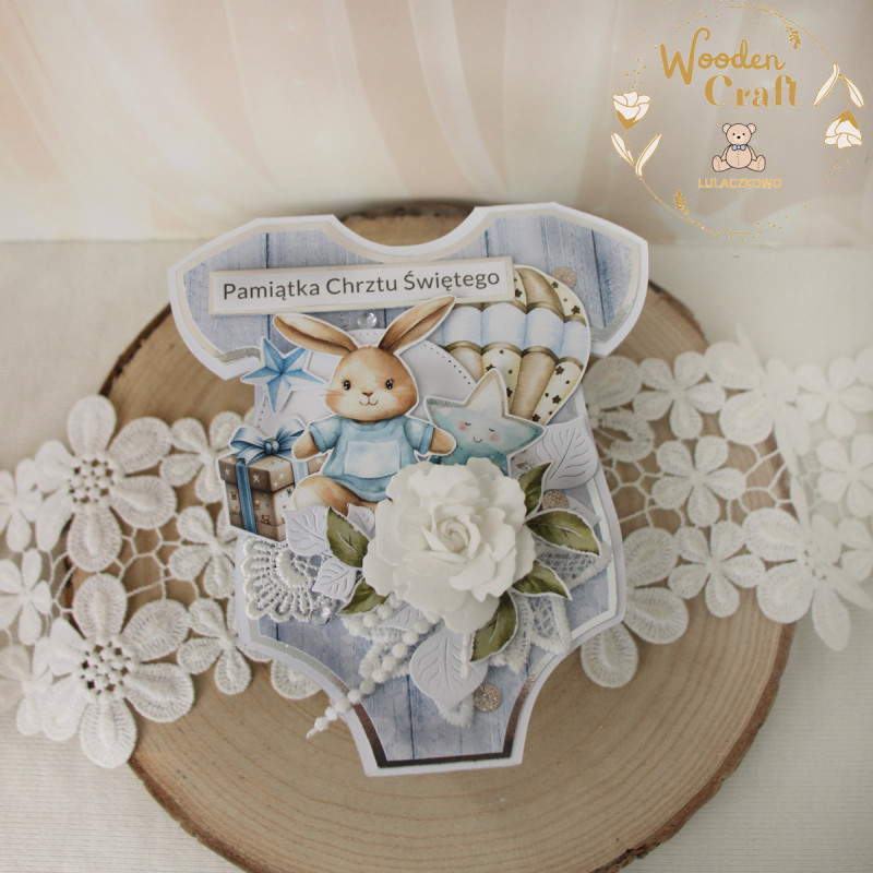 Urocza i nietuzinkowa kartka z okazji Chrztu Świętego, w kształcie dziecięcego body, wykonana z mixu dziecięcych kolekcji papierów, utrzymana w odcieniach bieli, beżu i delikatnego błękitu, z dodatkiem błyszczących, srebrnych akcentów. Kartka wykonana ręcznie z dbałością o każdy szczegół. Na środku znajduje się grafika słodkiego króliczka, ozdobiona kompozycją kwiatową z ręcznie robioną różyczką, dodatkowo zdobiona grafikami gwiazdki, balonika i prezentu, kryształkami oraz połyskującymi cekinami, a także napisem "Pamiątka Chrztu Świętego" (na życzenie mogę dodać również imię dziecka, bądź całkowicie zmienić napis na dowolny - w zależności od okazji).