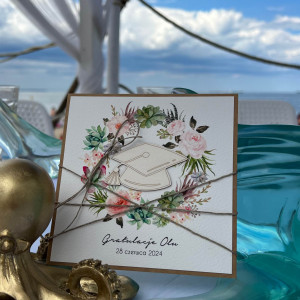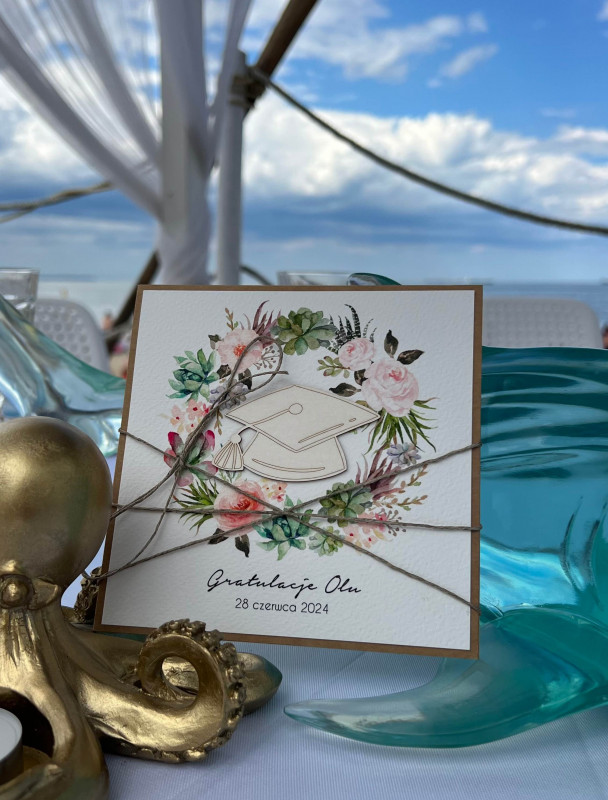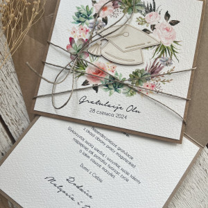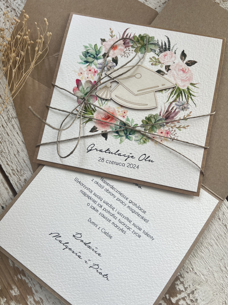 Stylowa kartka z okazji ukończenia szkoły, obrony pracy dyplomowej - w zestawie z kopertą. Wymiary kartki 14x14 cm.