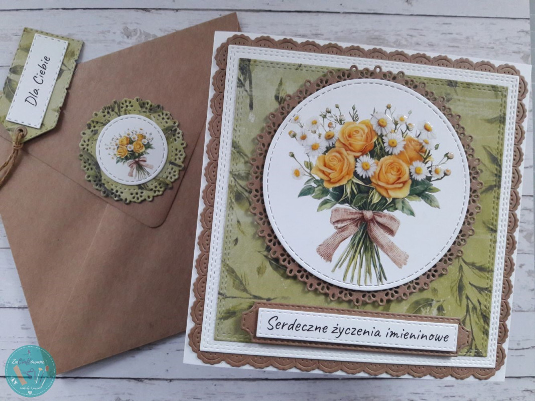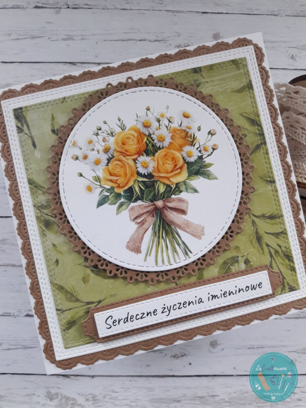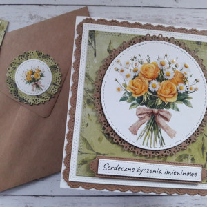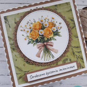 Kartka imieninowa (lub na inną okazję) z bukietem róż i stokrotek