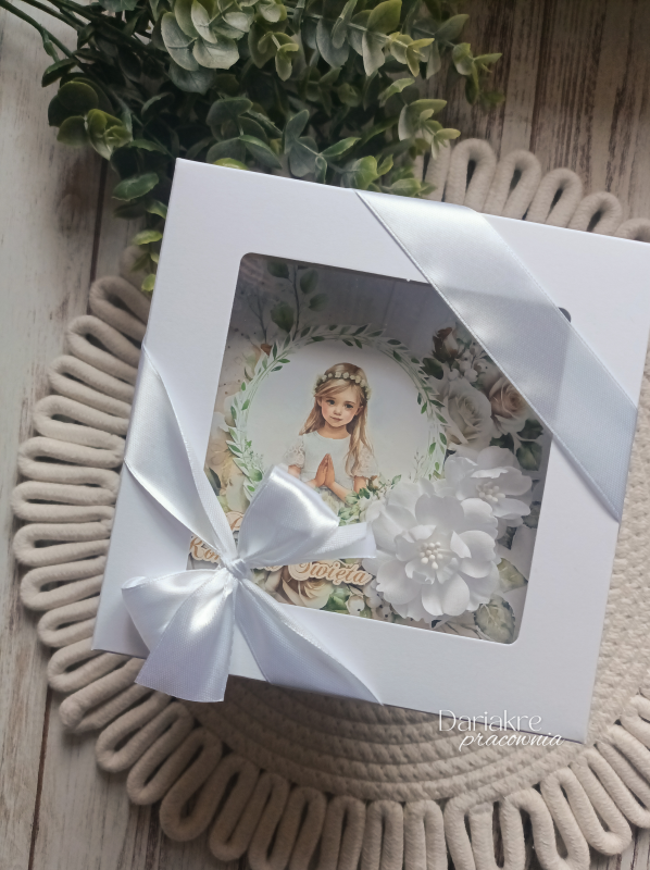 - Pudełko przewiązane wstążką w kolorystyce pasującej do wnętrza kartki.