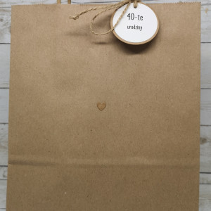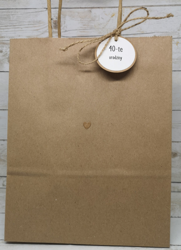Całość zapakowana w papierową torebkę z dołączoną etykietką (40-te urodziny)