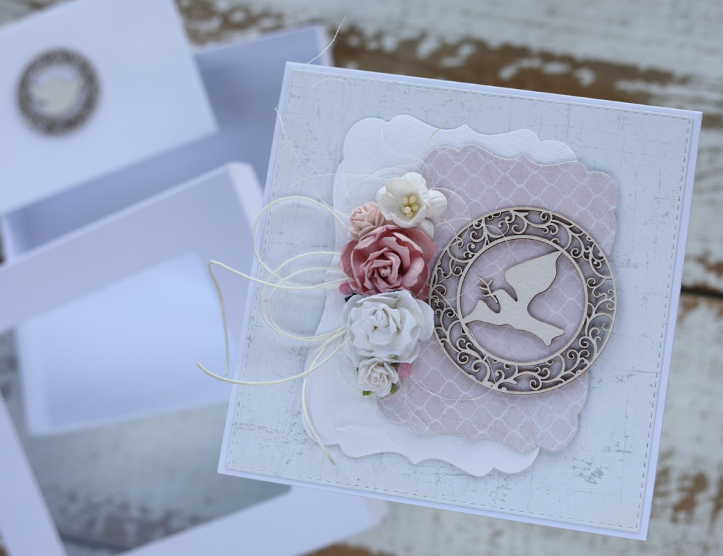 W zestawie pudełko z okienkiem i biała kopertą na pieniądze z naklejonym ozdobnym gołąbkiem.