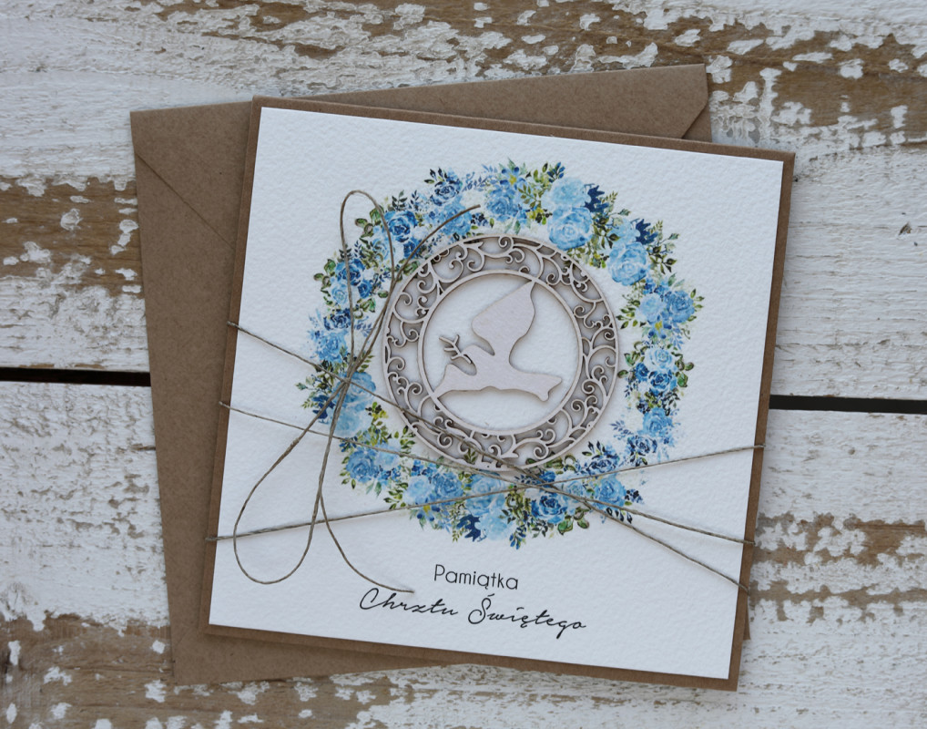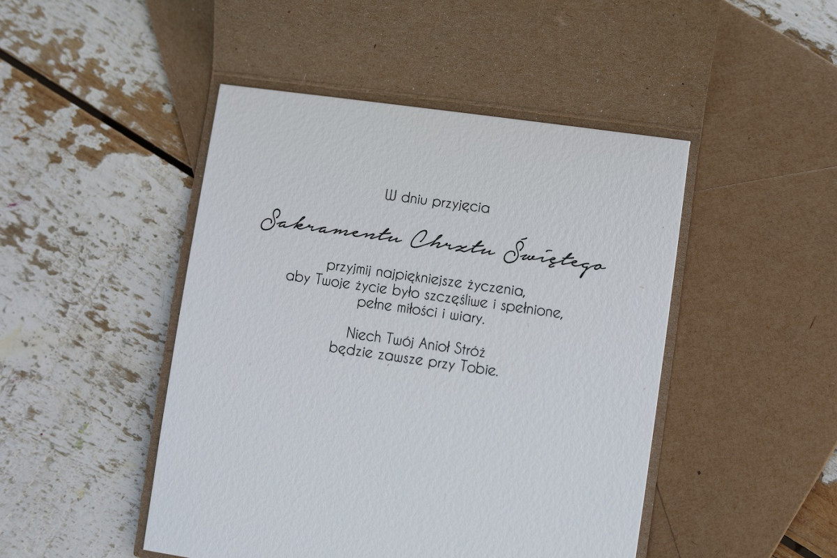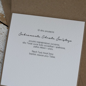 Stylowa kartka na chrzest wykonana z papieru bawełnianego oraz kraftowego.