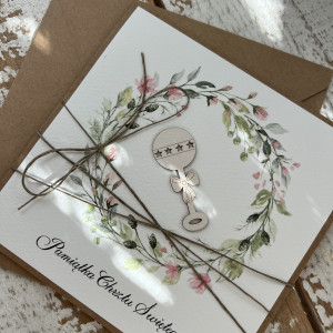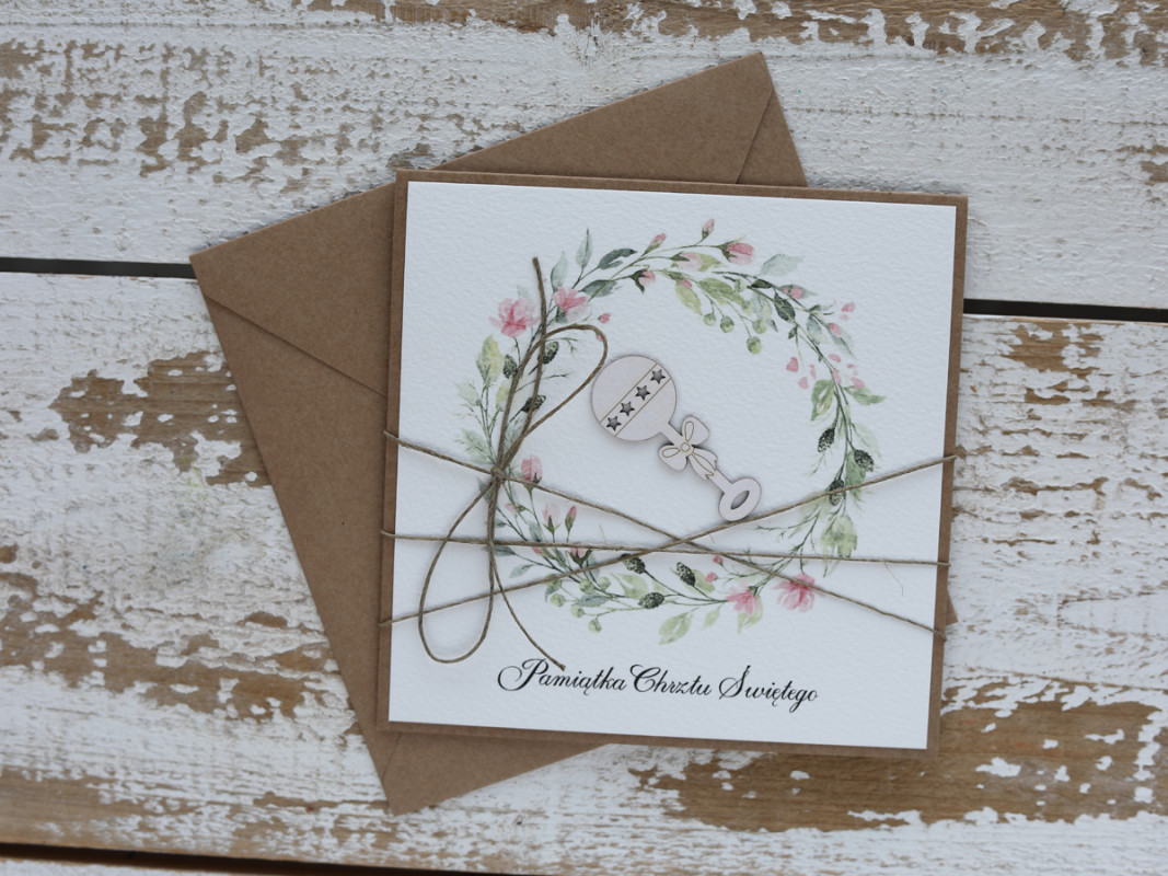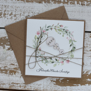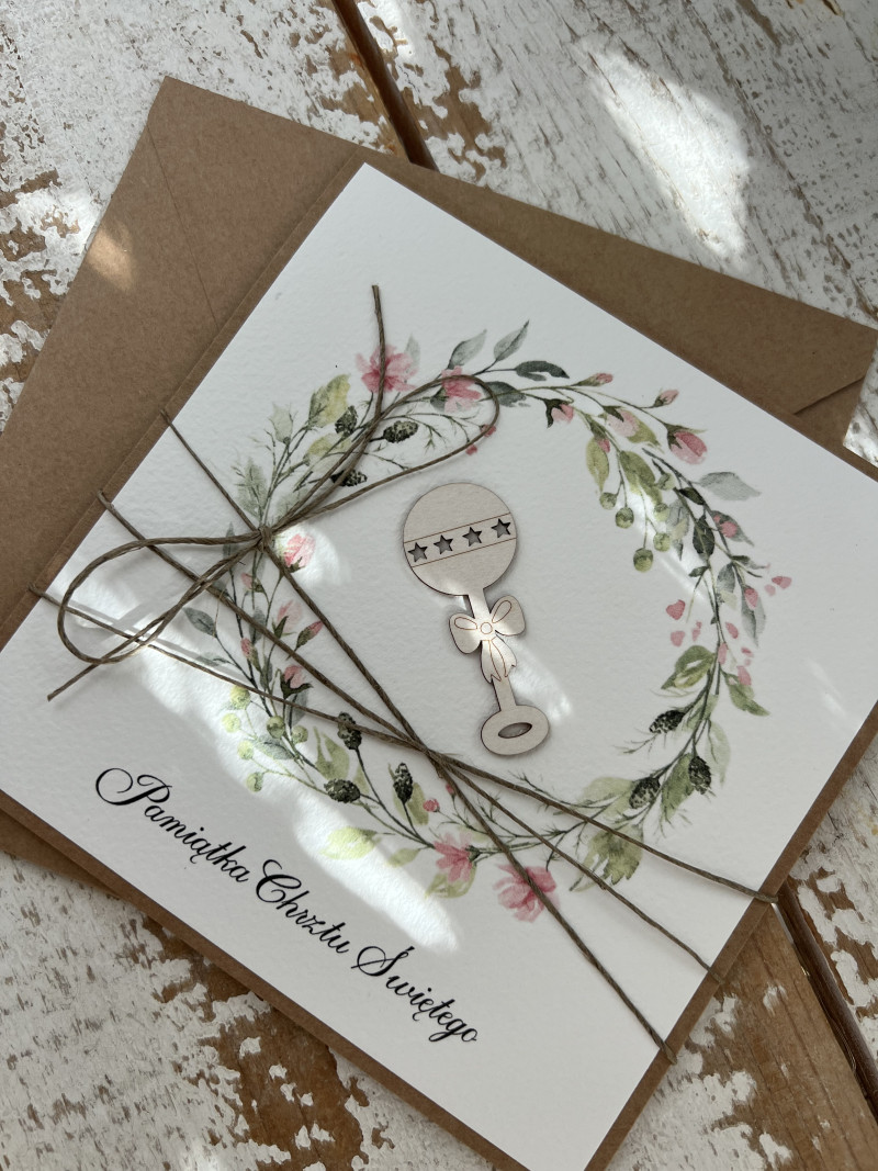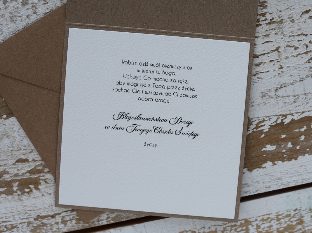 Stylowa kartka na chrzest wykonana z papieru bawełnianego oraz kraftowego.