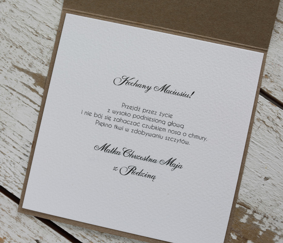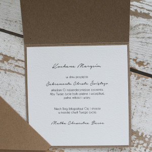 Stylowa kartka na chrzest wykonana z papieru bawełnianego oraz kraftowego.