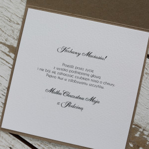 Wymiar kartki 14x14 cm, w zestawie brązowa koperta, kartka przewiązana lnianym sznureczkiem.