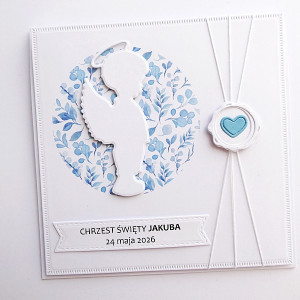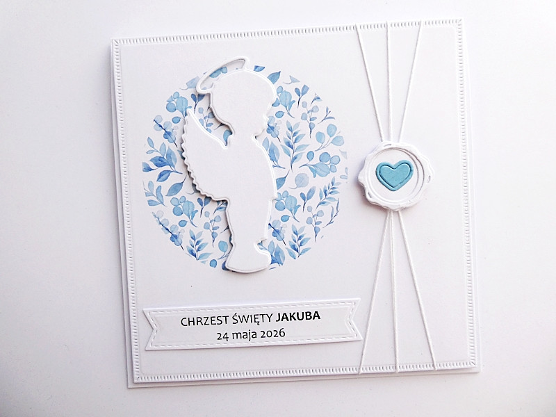 Niezwykle subtelna i delikatna - z oryginalną grafiką w niebieskim kolorze, wyciętą z papieru postacią aniołka-chłopczyka i dekoracyjnym sznurkiem ozdobionym papierową pieczęcią z sercem.