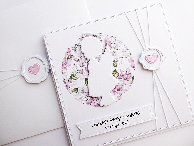 Pastelowa - przyozdobiona delikatną kwiatową grafiką i wyciętą z papieru postacią aniołka-dziewczynki, a także dekoracyjnym sznureczkiem oraz papierową pieczęcią z sercem.