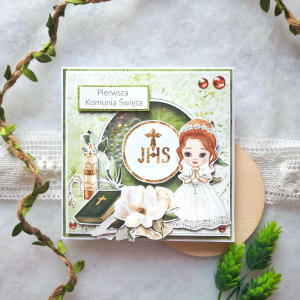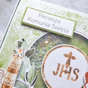 Kartka z okazji Pierwszej Komunii Świętej w kolorach zieleni i złota, z shakerem z błyszczącym wkładem.