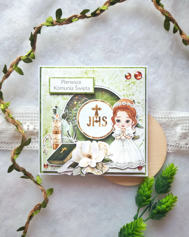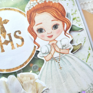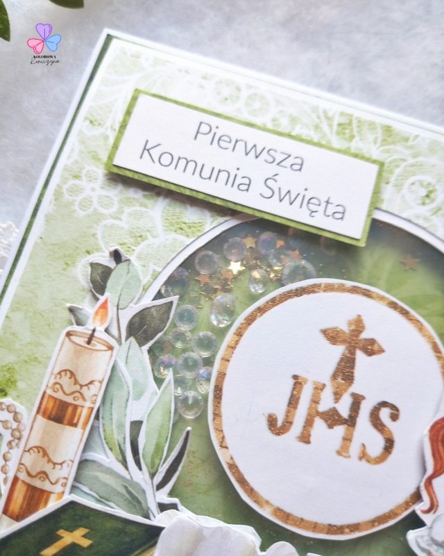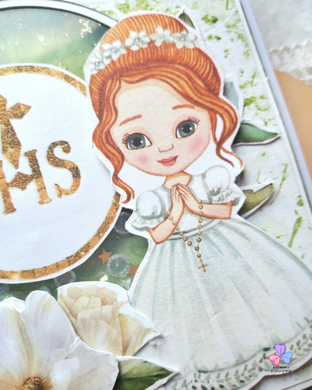 Główna część kartki to shaker zrobiony ze złotego brokatu, złotych gwiazdek oraz przezroczystych kryształków. Kartka zawiera także grafiki nawiązujące do tematu: dziewczynkę w stroju komunijnym, świece, modlitewnik oraz różaniec. Na kartce znajduje się też napis "Pierwsza Komunia Święta" oraz pomarańczowe pół-kryształki.