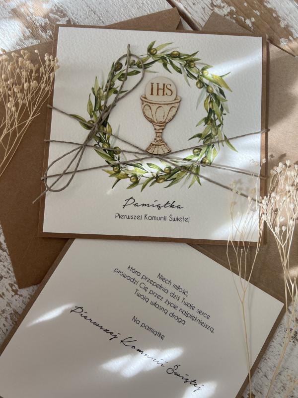 Stylowa kartka eko na komunię wraz z kopertą - wykonane papieru bawełnianego oraz kraftowego oraz ozdobnej tekturki.