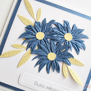 Kartka ma wklejoną w środku granatową wkładkę wraz z białym karnetem do odręcznego wpisania życzeń.