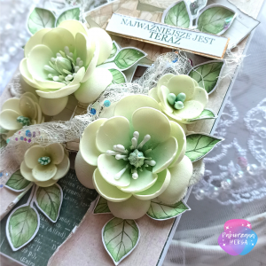 Całość otulają ręcznie wykonane kwiaty w odcieniach pistacjowej zieleni, koronkowe dodatki, listki i połyskujące cekiny.