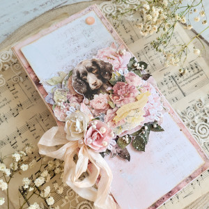Poszczególne elementy przyklejone są na kostkach dystansowych, co daje efekt 3D. Pracę zdobią dodatkowo kwiaty z papieru oraz wstążka vintage.