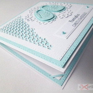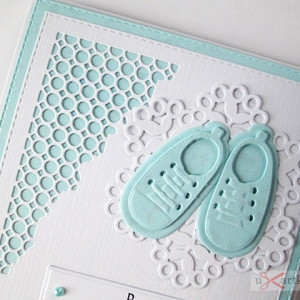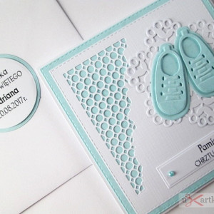 Główną ozdobę kartki stanowią subtelne ażurowe wycinanki. Na jednej z nich zostały umieszczone chłopięce buciki. Uroku kartce dodaje niebieski papier z bardzo delikatnym różanym nadrukiem.