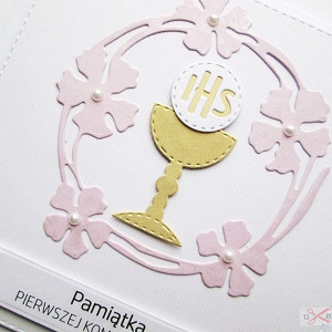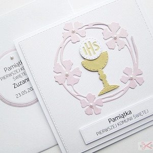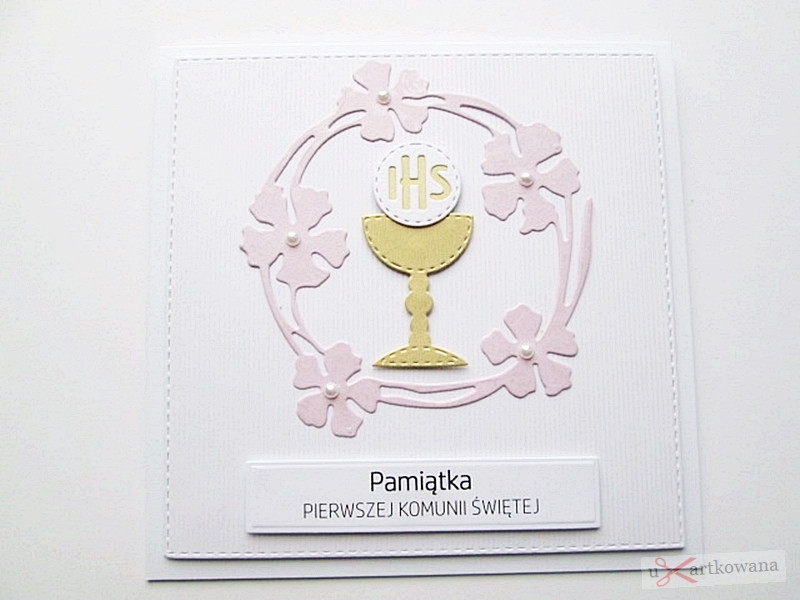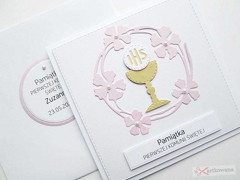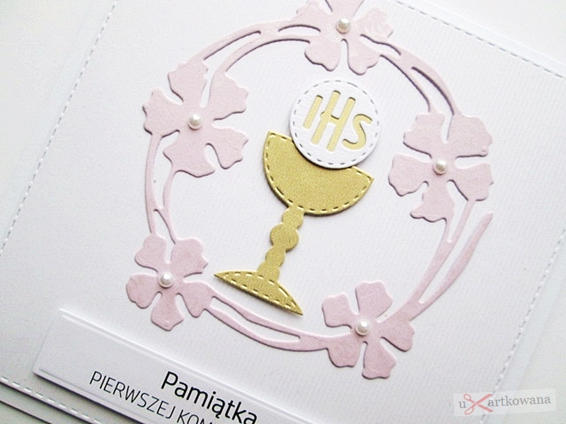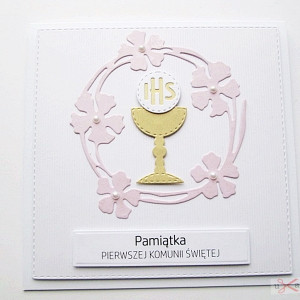 Kartka jest bardzo elegancka. Zdobi ją urokliwy różowy wianek, w środku którego umieszczony został złocisty kielich z Hostią.
