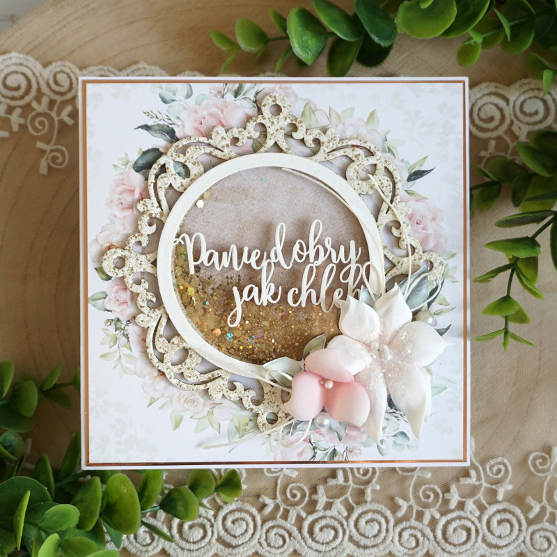 Kartkę zdobi shaker box z napisem "Panie dobry jak chleb". Wewnątrz shakera znajduje się złoty brokat, który porusza się przy potrząśnięciu.