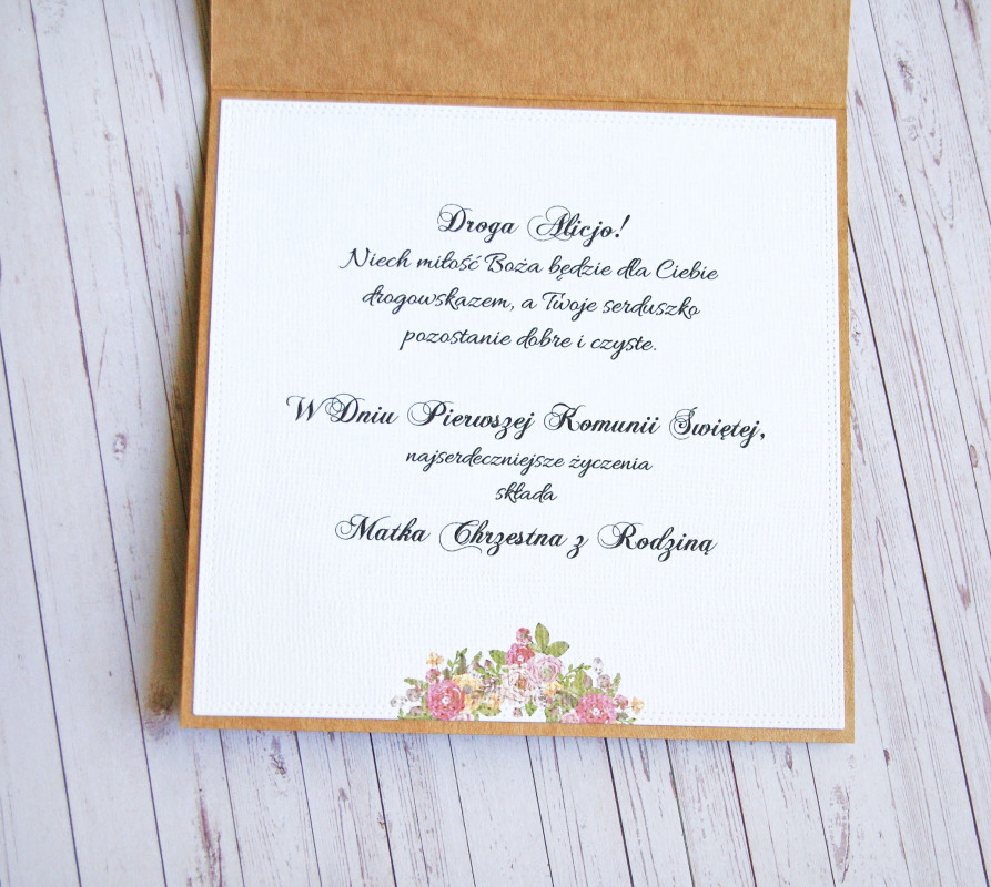 Życzenia w ozdobnej formie wydrukowane na tym samym papierze ozdobnym co front kartki.