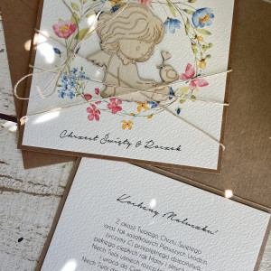 Stylowa kartka na pierwsze urodziny - w zestawie z kopertą. Wymiary kartki 14x14 cm. W zestawie z kopertą.