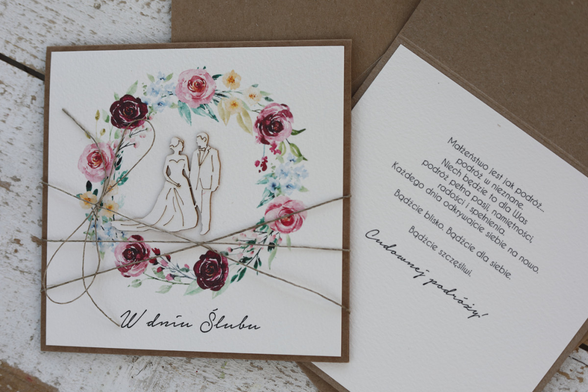 Wymiar kartki 14x14 cm, w zestawie brązowa koperta.