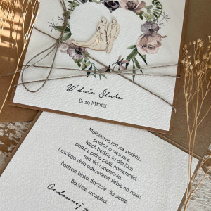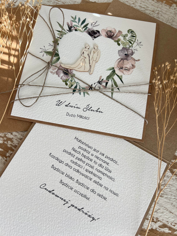 Kartka 14x14 wraz z kopertą. Kartka wykonana z papieru kraftowego, papieru bawełnianego 100% w odcieniu śmietanki. W zestawie koperta. W środku gotowe życzenia jak na zdjęciu.