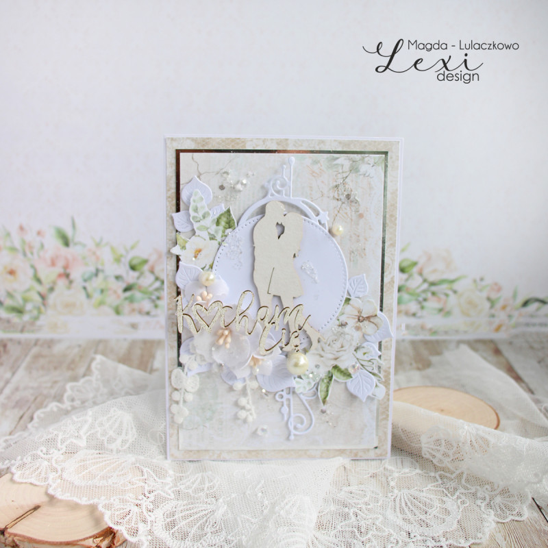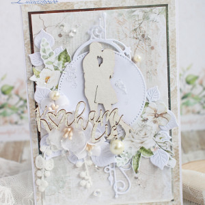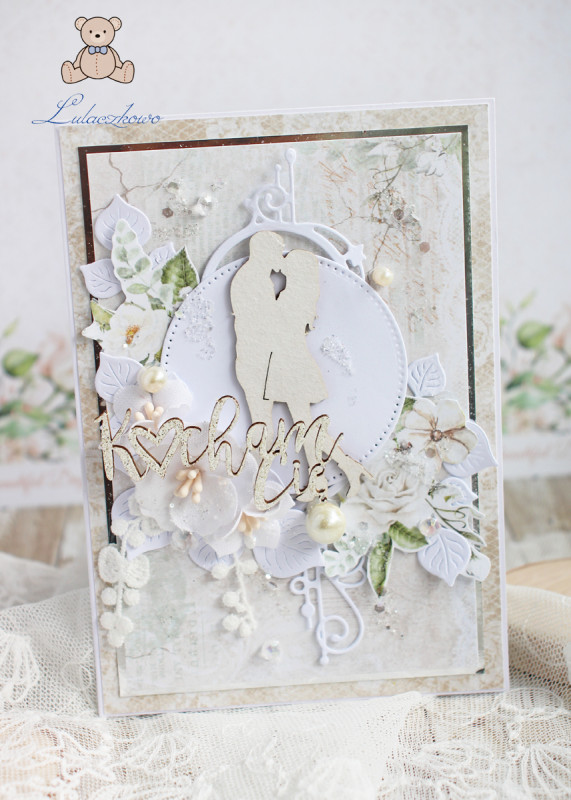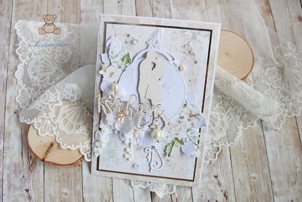 Piękna i delikana kartka ślubna, utrzymana w odcieniach bieli i jasnego beżu z dodatkiem mięty i błyszczących srebrnych akcentów. Wykonana ręcznie z pięknej kolekcji papierów "Together Forever". Kartka ozdobiona tekturką przedstawiającą zakochanych, ozdobiona złoconą tekturką napisem "Kocham Cię", kompozycją kwiatową z ręcznie wykonanymi kwiatami, z dodatkiem koronek, perełek, połyskującego brokatu.