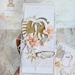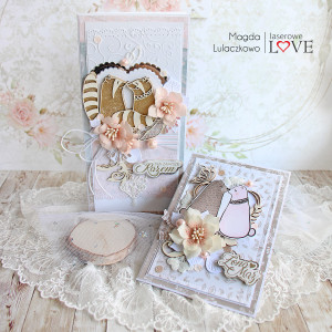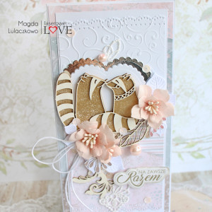 Romantyczna i urocza, bogato zdobiona kartka ślubna, utrzymana w odcieniach delikatnego, pudrowego różu, bieli i beżu. Wykonana ręcznie z najnowszej, prześlicznej kolekcji papierów "Forest Celebration". Kartka ozdobiona złoconą tekturką warstwową, przedstawiającą uroczą parę zakochanych szopów, otoczoną kompozycją kwiatową, z dodatkiem koronek, perełek, a także tekturkowym "Na zawsze razem".