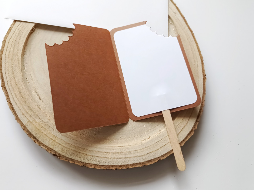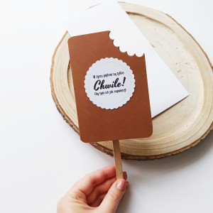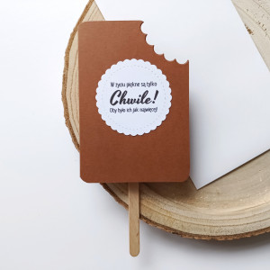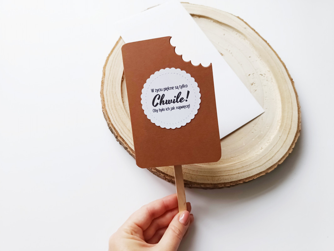 Ręcznie wykonana brązowa kartka w wyglądzie lodów na jakąkolwiek okazję. W komplecie koperta i ochronna folia. Wymiary 19,5 na 9 cm. Istnieje możliwość dodania spersonalizowanego napisu oraz zamówienia podobnej kartki w innej kolorystyce (bardzo proszę o kontakt przed zakupem).